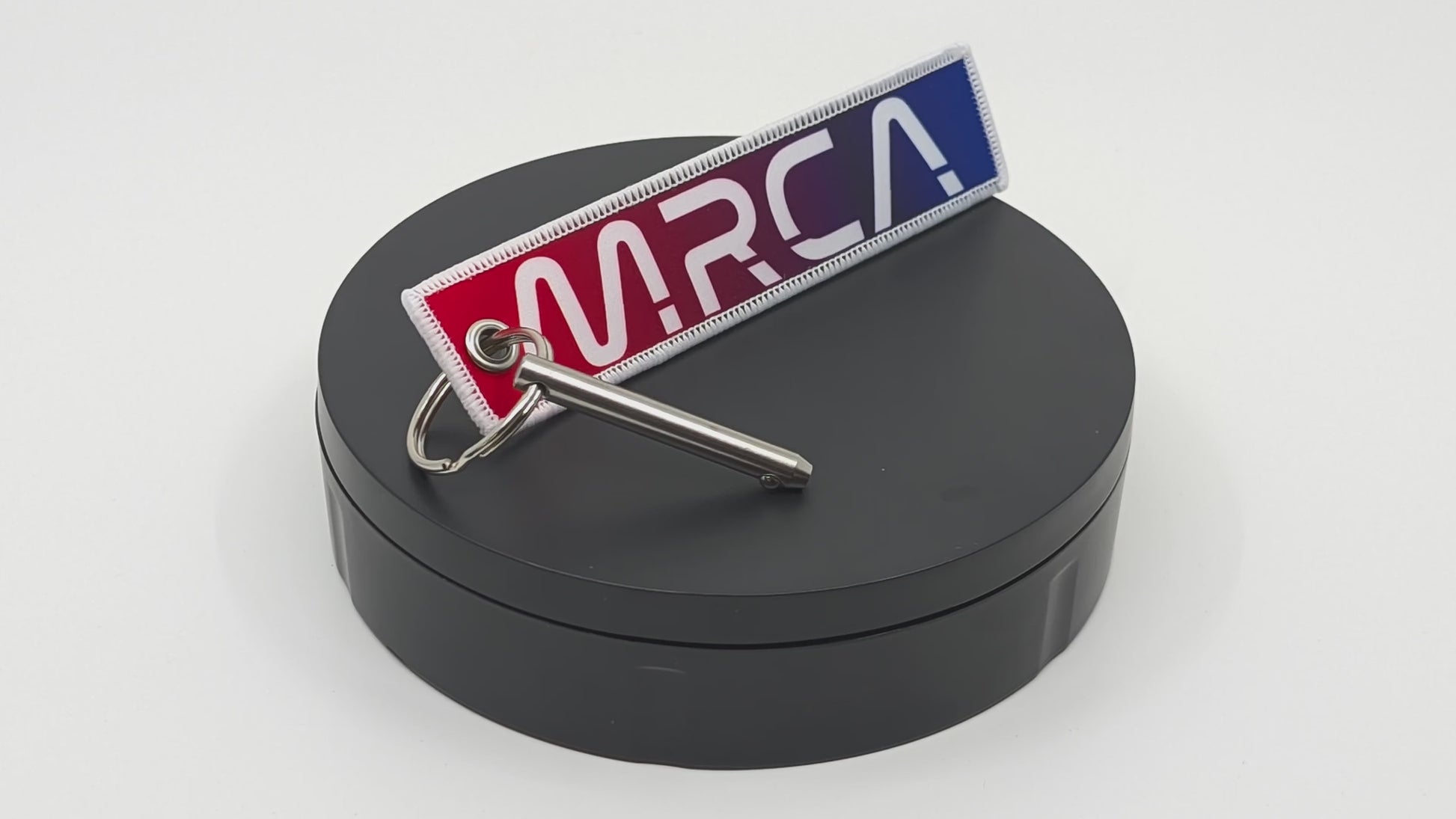 This is a MRCA Remove Before Fight Keychain with Detent Pin. It can be used as a weapon lock for some types of robots. The tag makes it easier to identify if your weapon lock is still in your robot.